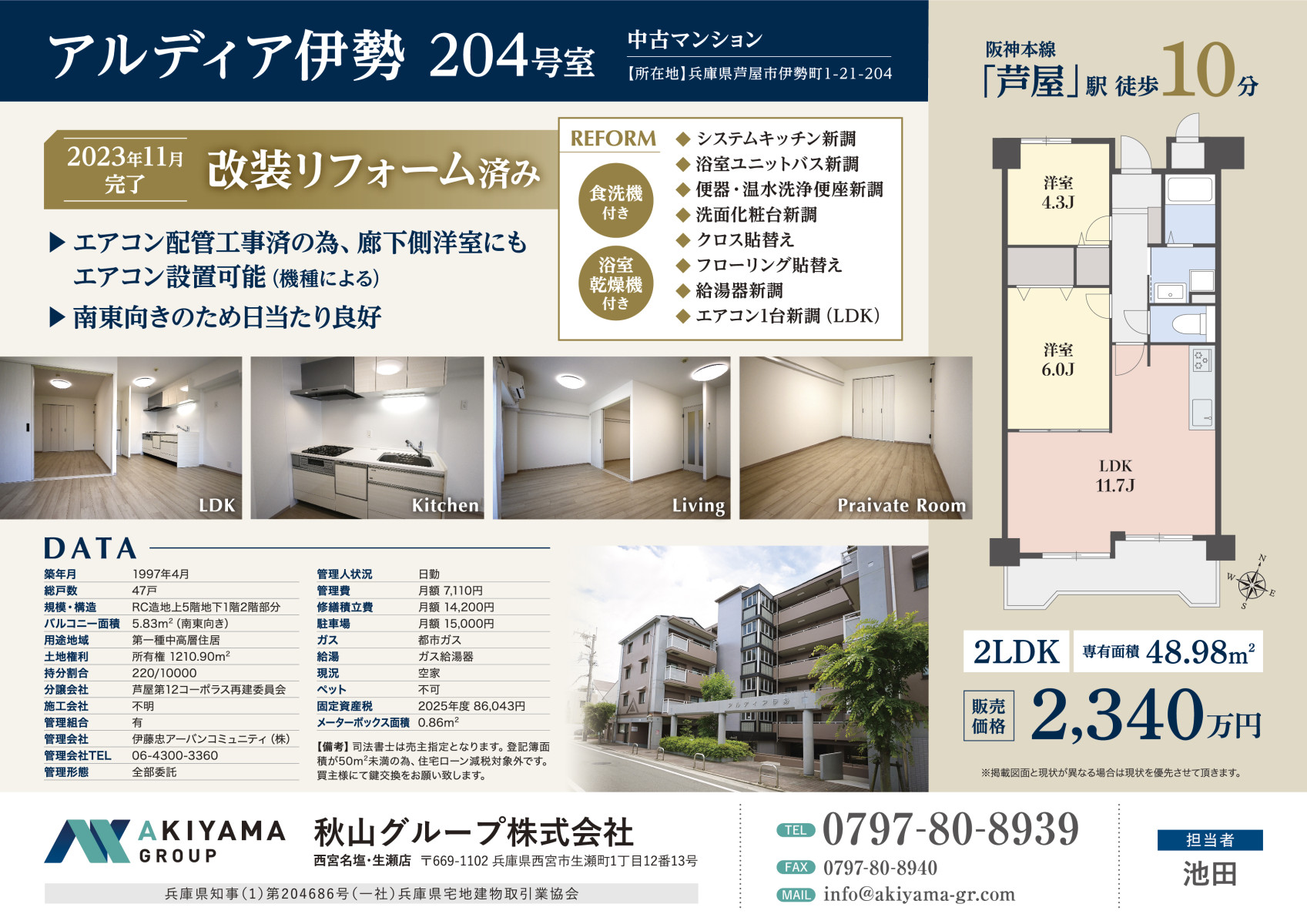新規物件のご紹介です 芦屋市にある「アルディア伊勢」 ~オススメポイント~ ①2023年11月リフォ