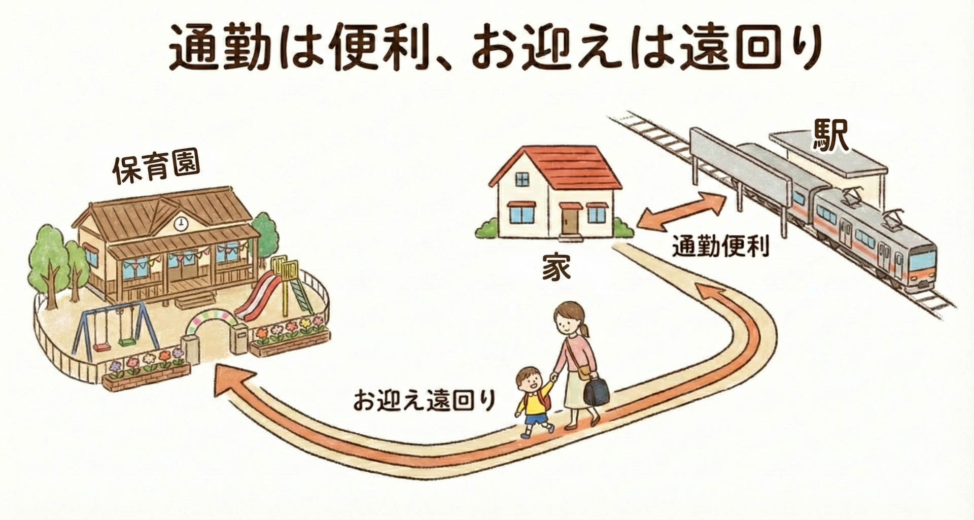 家は駅のすぐ近くにあり、通勤は便利だが、保育園は駅から離れているため送迎は遠回りになる。