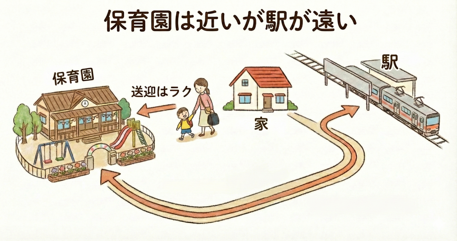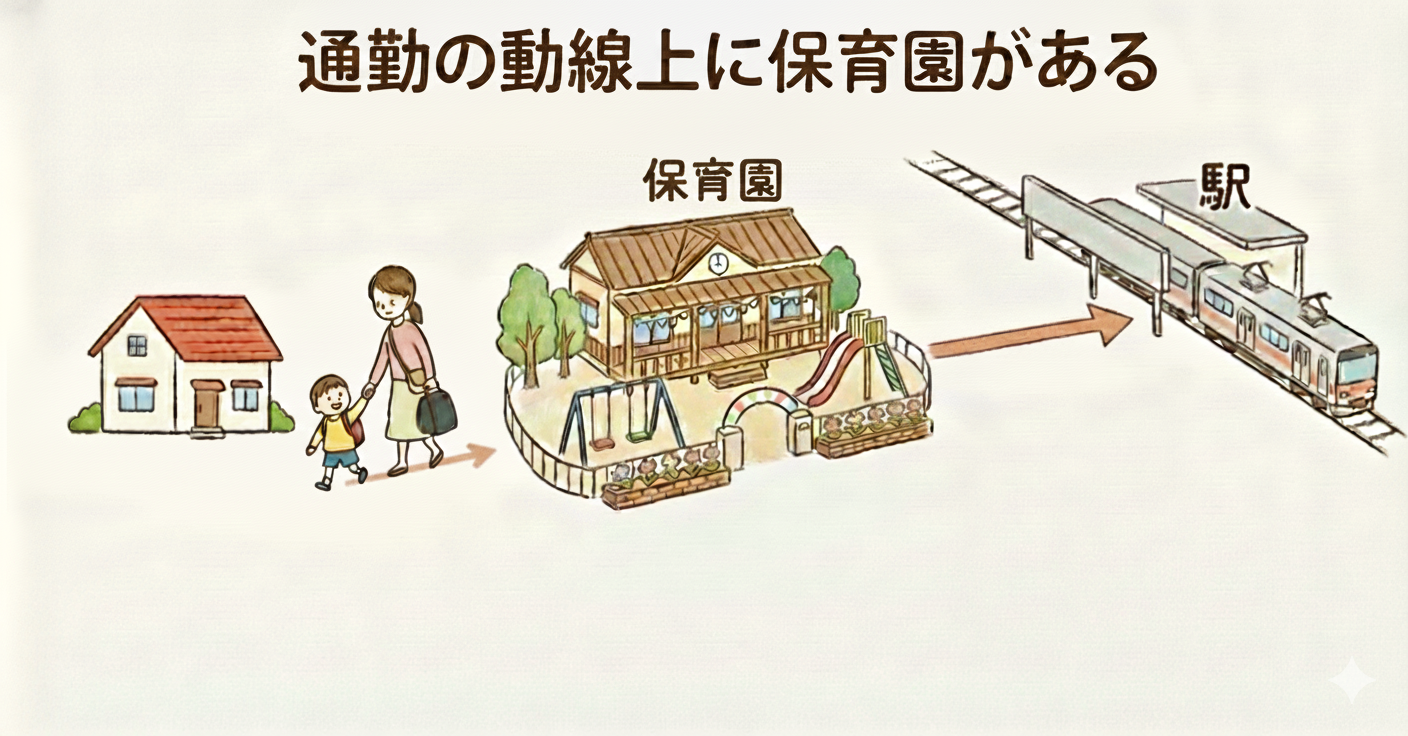 家から駅の途中に保育園があり、送迎と通勤の動線が自然につながっている。流れがスムーズで、両立しやすい理想的な配置。