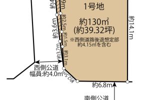 - 南側幅員約6.0mに約6.8m接道、西側幅員約3.4m~約4.0mに約12.2m接道